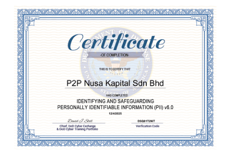 P2P Nusa Kapital Sdn. Bhd. have successfully obtained a Best Practices Certification from the U.S. Department of Defense, recognizing our strong data-protection controls across all stakeholders, including staff, customers and vendors.