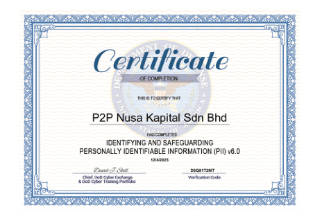 P2P Nusa Kapital Sdn. Bhd. have successfully obtained a Best Practices Certification from the U.S. Department of Defense, recognizing our strong data-protection controls across all stakeholders, including staff, customers and vendors.